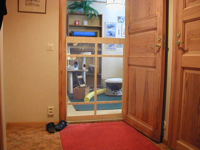 The gate is acrylic glass, 114 cm high. The door can also be closed which I do for safety reasons when I'm not at home and during the night, and also to limit artificial light after dark to give the ferrets a natural photoperiod. |