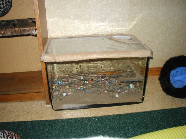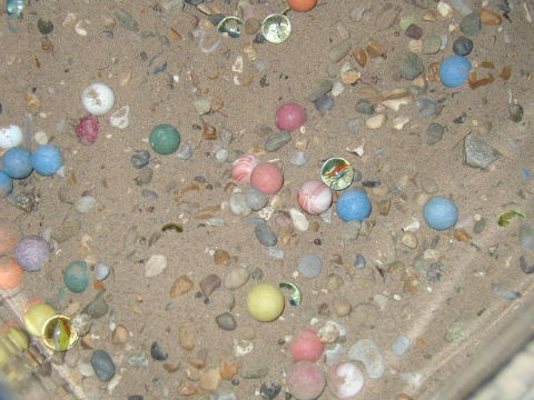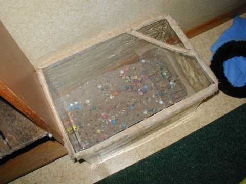 The dig box has a plastic top secured with velcro and contains a mix of sand, pebbles, and marbles.