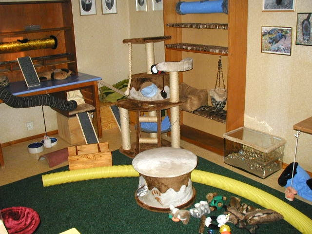 The room has many different levels which can be accessed by climbing or by ramps and tubes. There are plenty of cosy beds, hammocks, nests and hideouts. The carpet is a heavy-duty outdoor version which is very easy to clean. |
