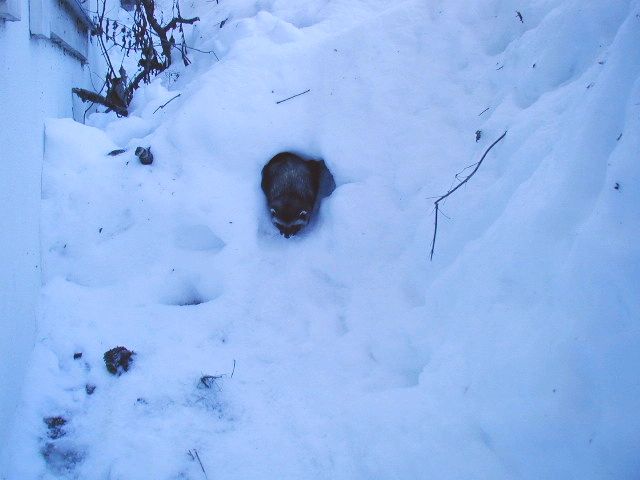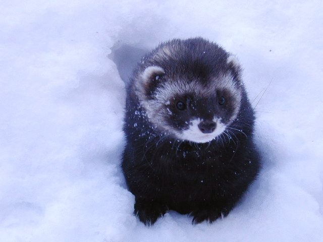 The ferrets spend most of their time underneath the snow cover where they have a huge network of caves and tunnels throughout the entire enclosure. This network is also including the frozen tunnels inside the hill well below the snow. The trees, bushes and logs provide natural spaces under the snow. Every once in a while, a ferret will pop up somewhere from one of the many tunnel openings!