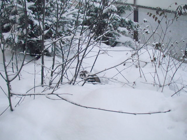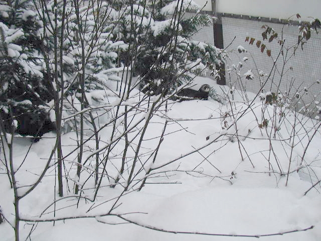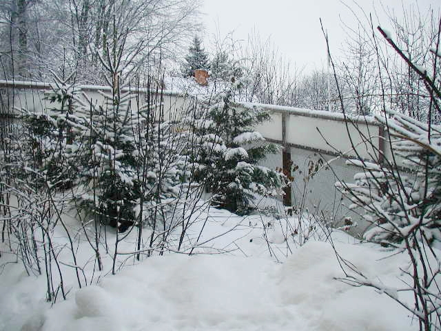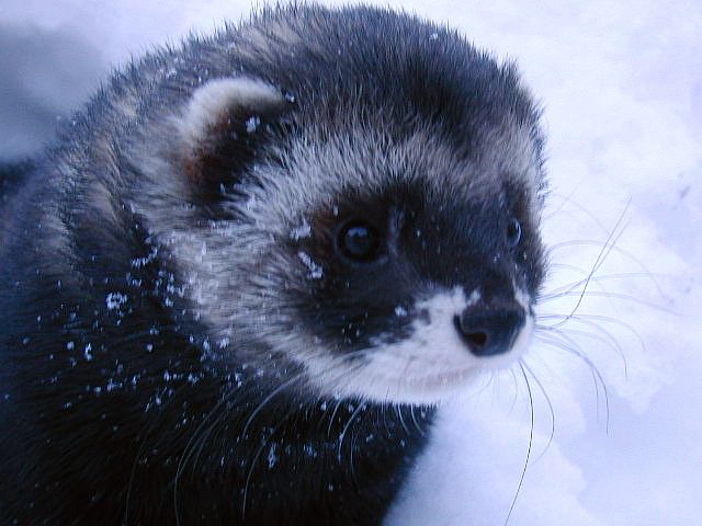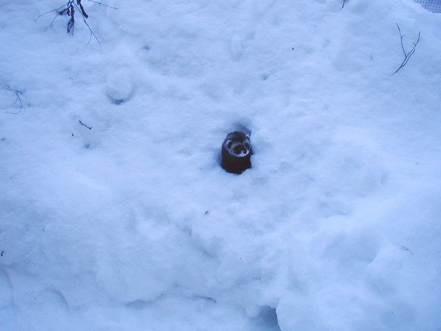 The winter landscape lies quiet and frozen, the snow cover very deep. I've had to shovel my way around the perimeter to make sure the ferrets can't get over the fence.