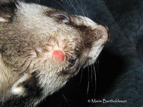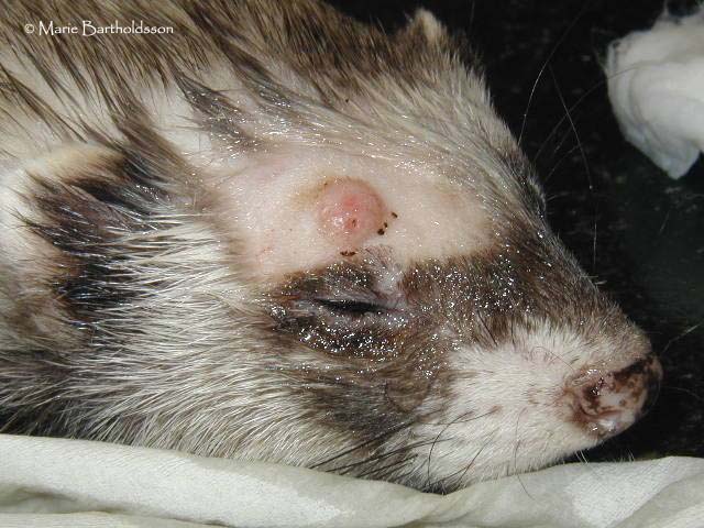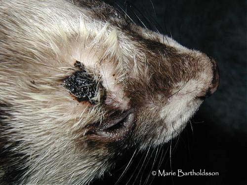 It started with a bite wound over the right eye. The wound healed nicely leaving a little bald spot.